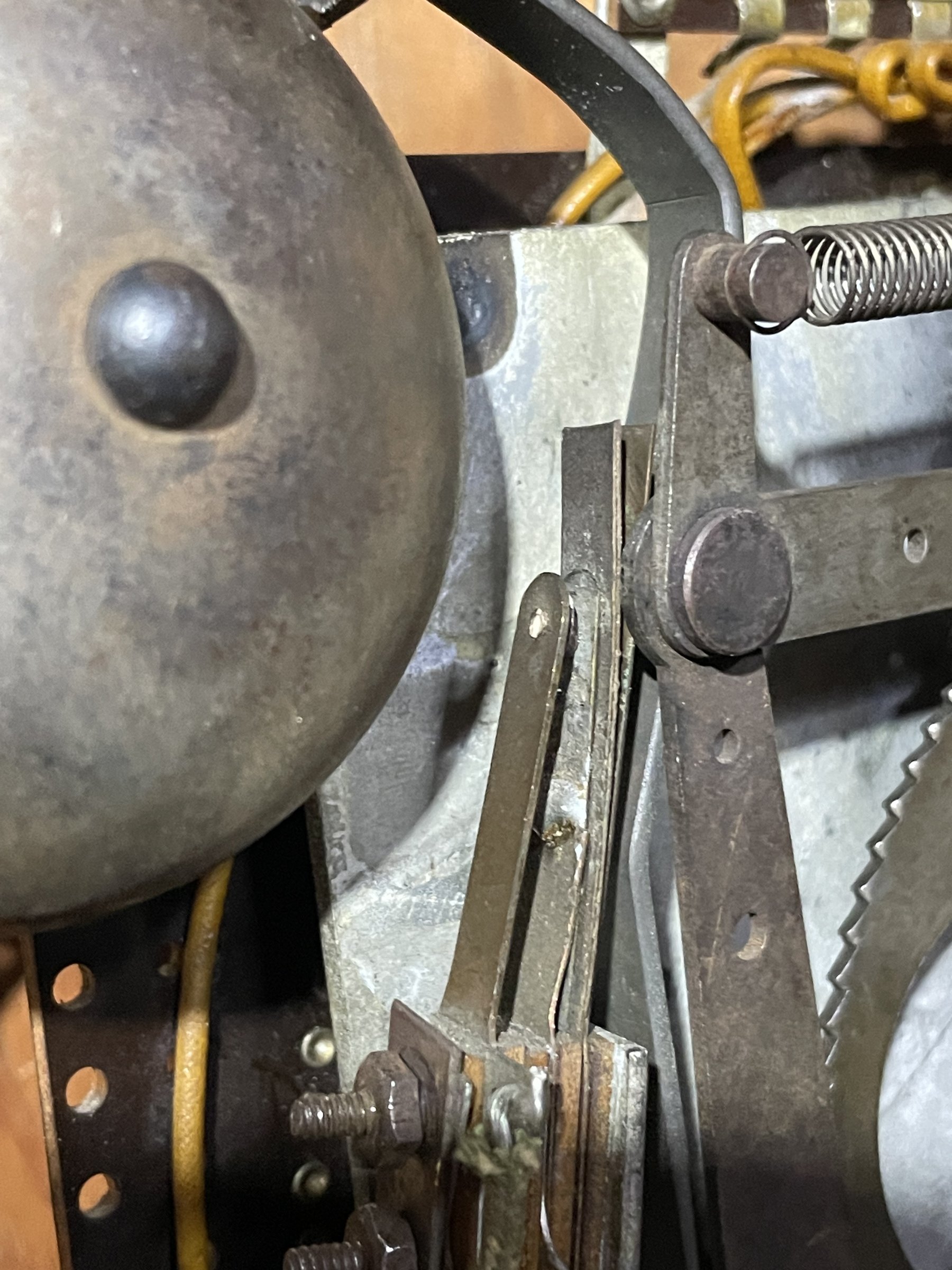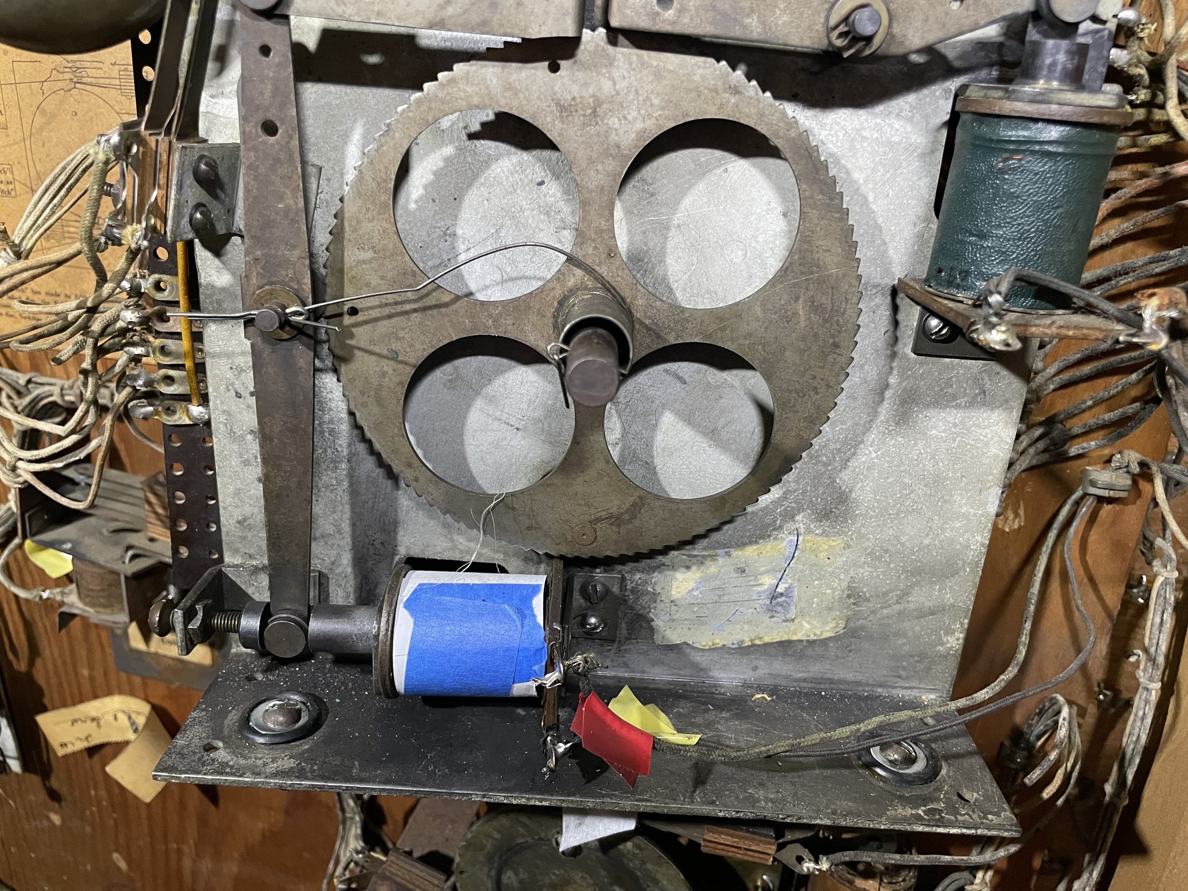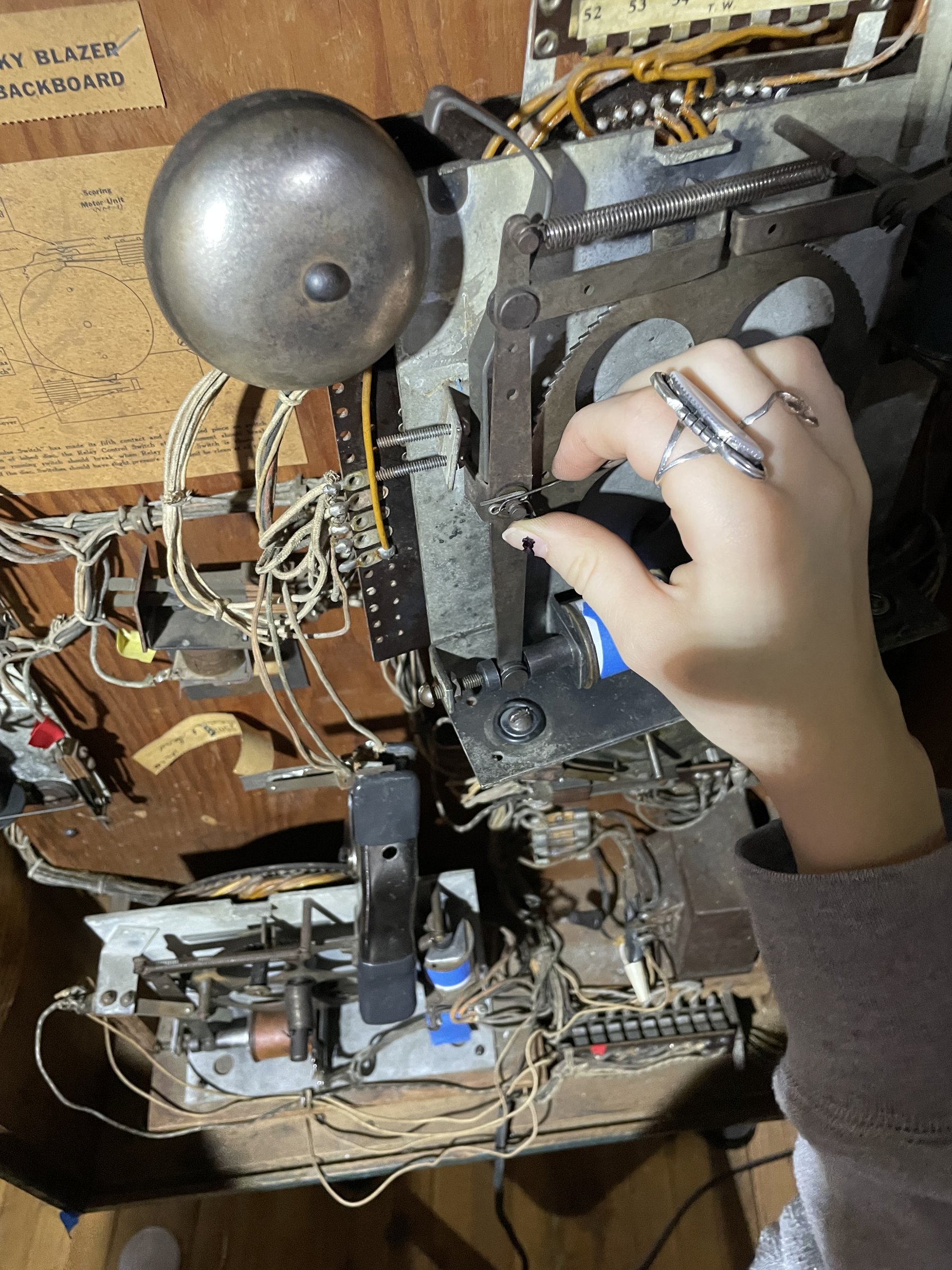 Kira and I refit the solenoids and the leaf switch. At first score advancement was sticky. We needed to keep the leaf switch and the spring arm clear of the wheel mechanisms and cog teeth, and it was good after that. Using the cotter pin hole turned out to be a nice way to hold the spring arm out of the way.
