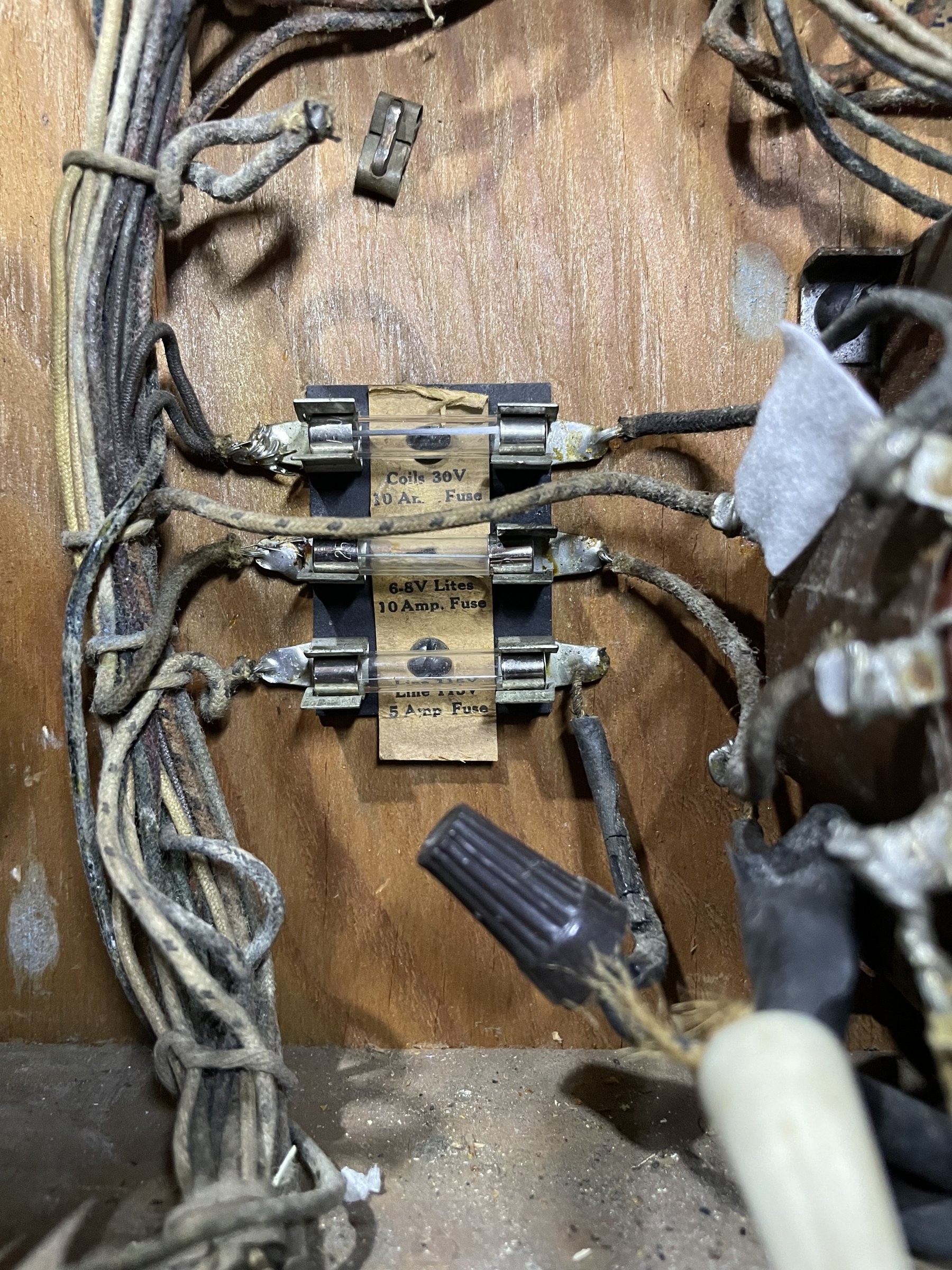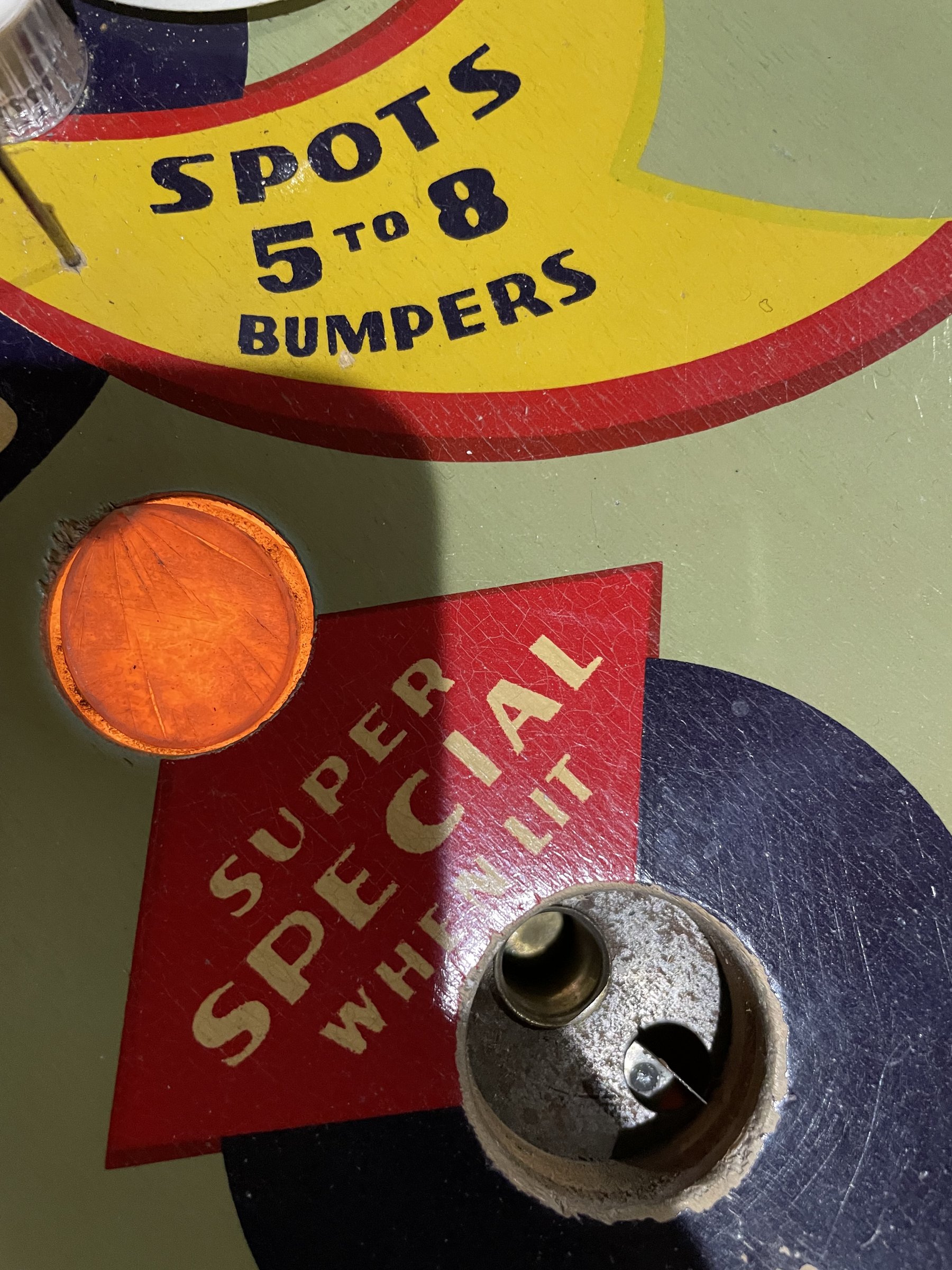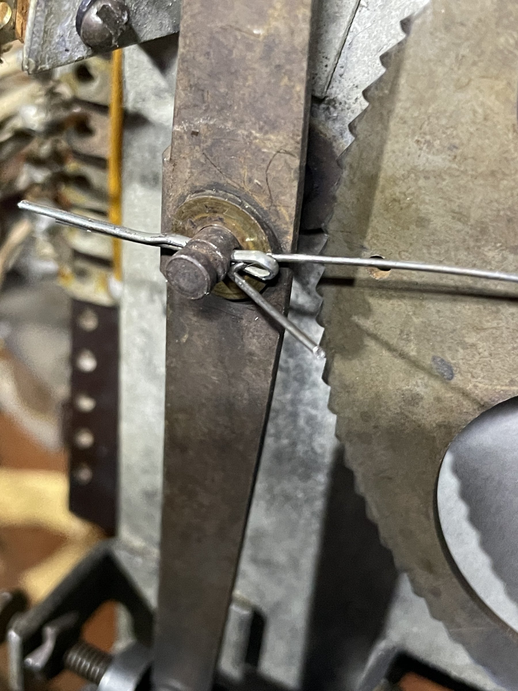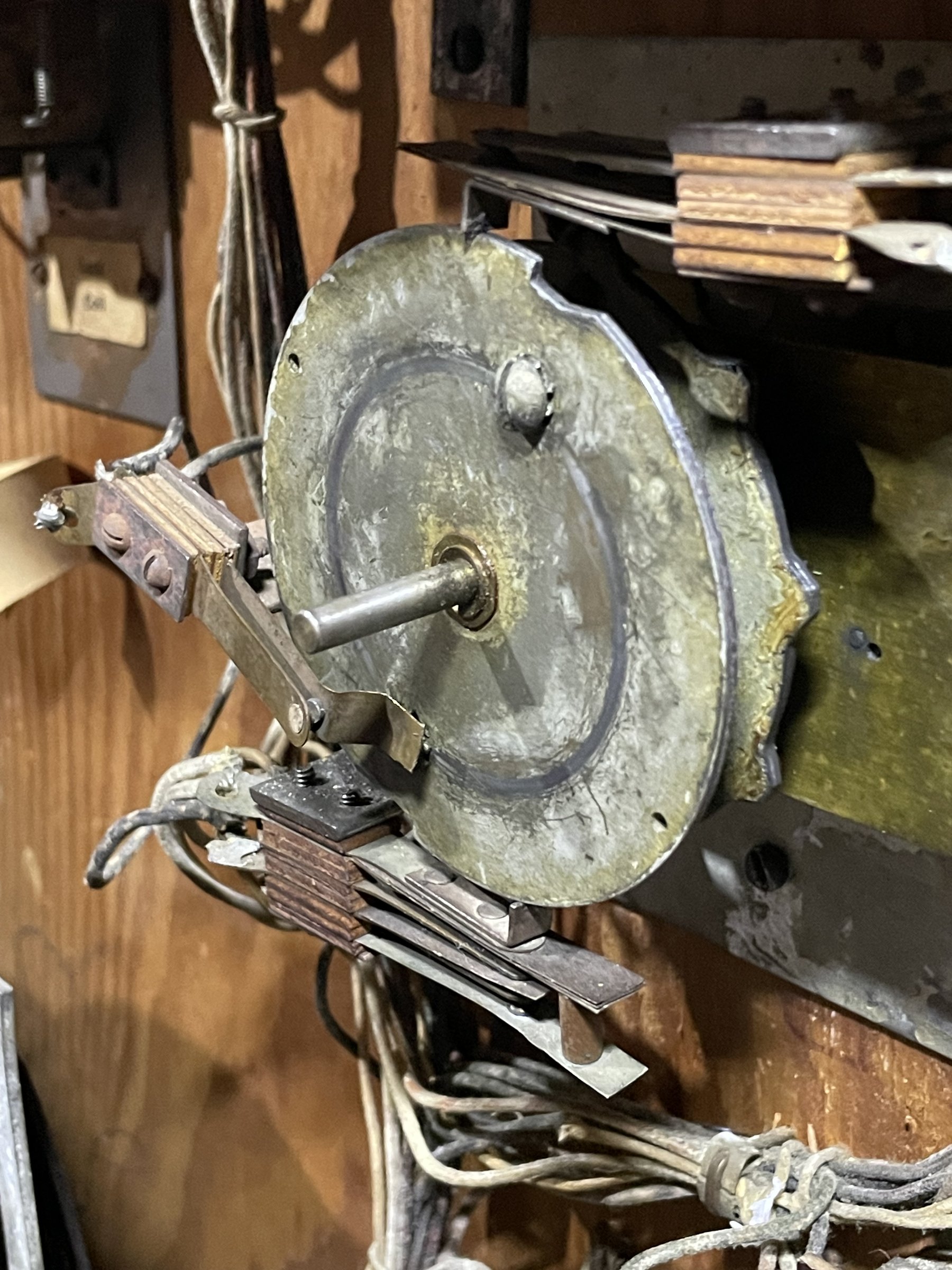 Kira and I refit the solenoids and the leaf switch. At first score advancement was sticky. We needed to keep the leaf switch and the spring arm clear of the wheel mechanisms and cog teeth, and it was good after that. Using the cotter pin hole turned out to be a nice way to hold the spring arm out of the way.