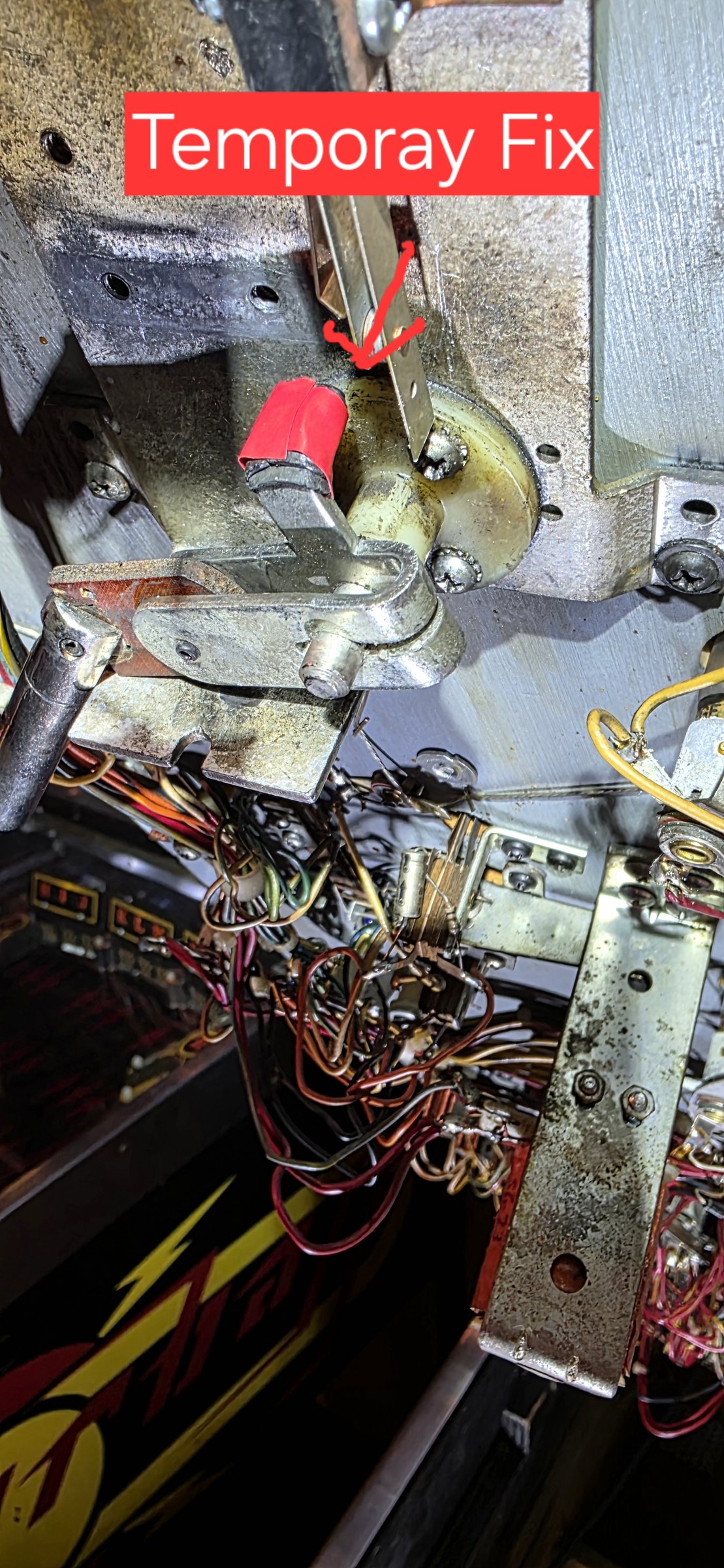 • A Rubber pad is worn down and revealing the metal beneath. With flipper in the up position there is metal on metal contact - Worn Part touched Leaf Arm. Could not remove the piece to flip it around.